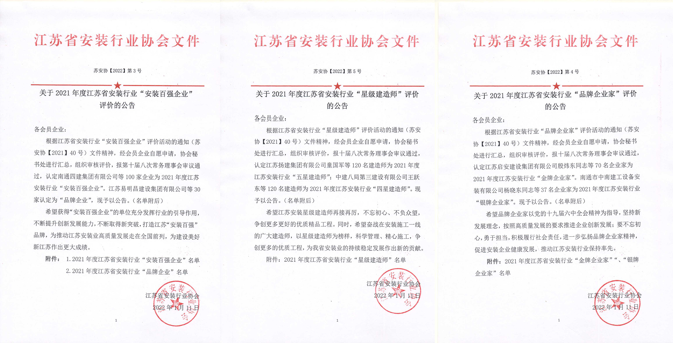 從江蘇省安裝行業協會獲悉,2021年度江蘇省安裝行業“安裝百強企業”、“品牌企業家”和“星級建造師”評價結果公布:我司...